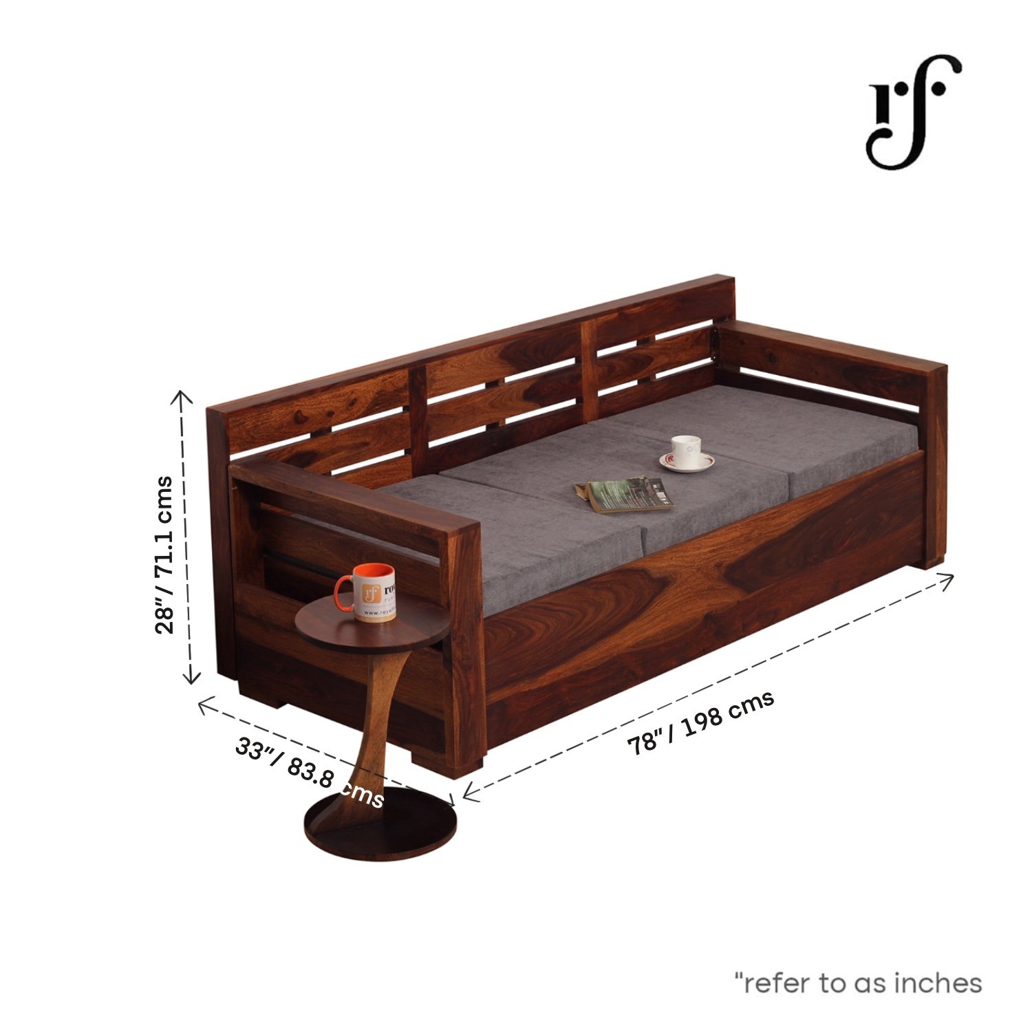 - Dimensions: Compact and space-efficient, with a length of 33″/83.8 CMS, width of 78″/198 CMS, and a back height of 28″/71.1 CMS.