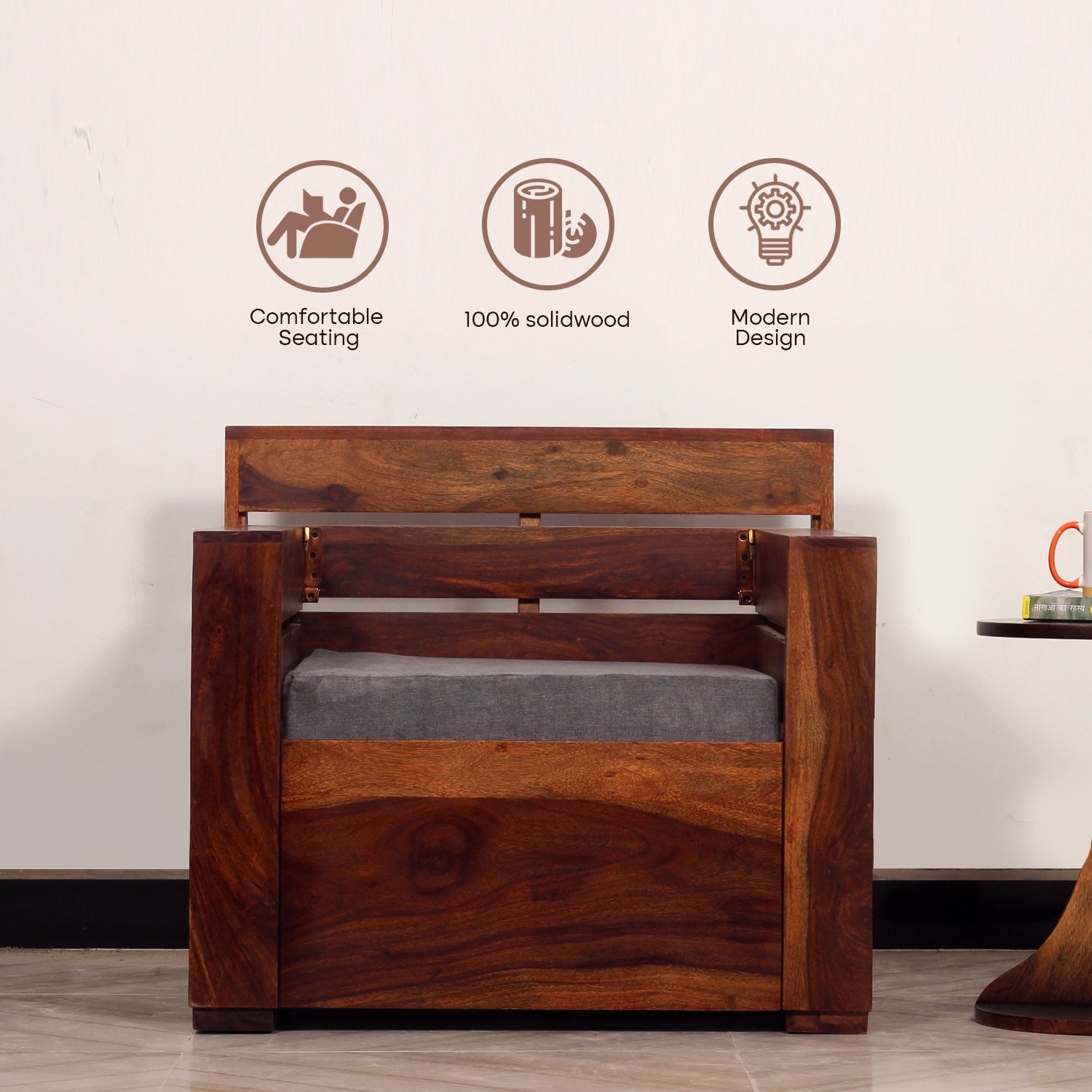 Introducing our Single Seater, meticulously crafted with precision and elegance. This furniture piece boasts a thoughtful design with specific dimensions for a perfect fit in your living space. The use of premium sheesham wood, renowned for its durability and beauty in furniture, ensures a lasting investment. The default natural color exudes a timeless charm, but we offer customization options to cater to individual preferences. The matte finish adds a touch of sophistication, making it a standout addition to your home.